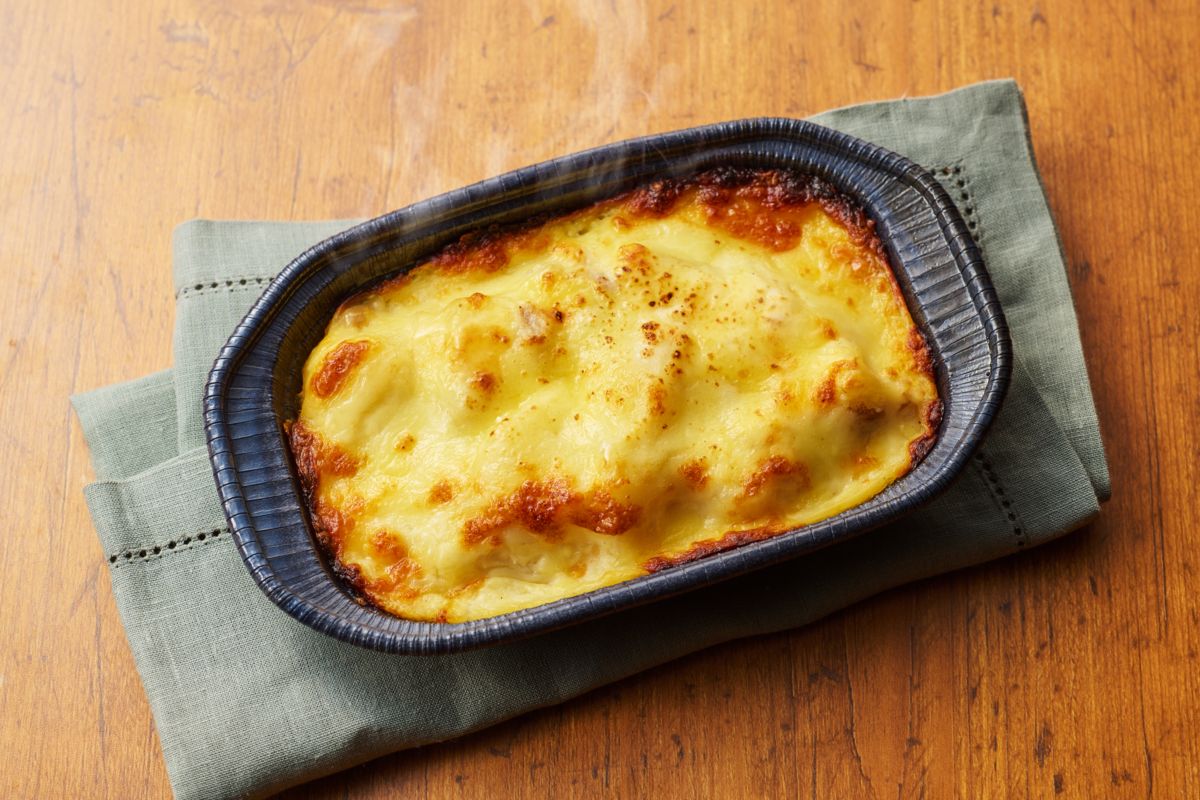 軽くつぶしたじゃがいもとホワイトソースを絡め、トッピングのチーズは温めるとどこまでも伸びるモッツァレラチーズをミックスして使用。小さなお子様でも楽しみながら召し上がれます。